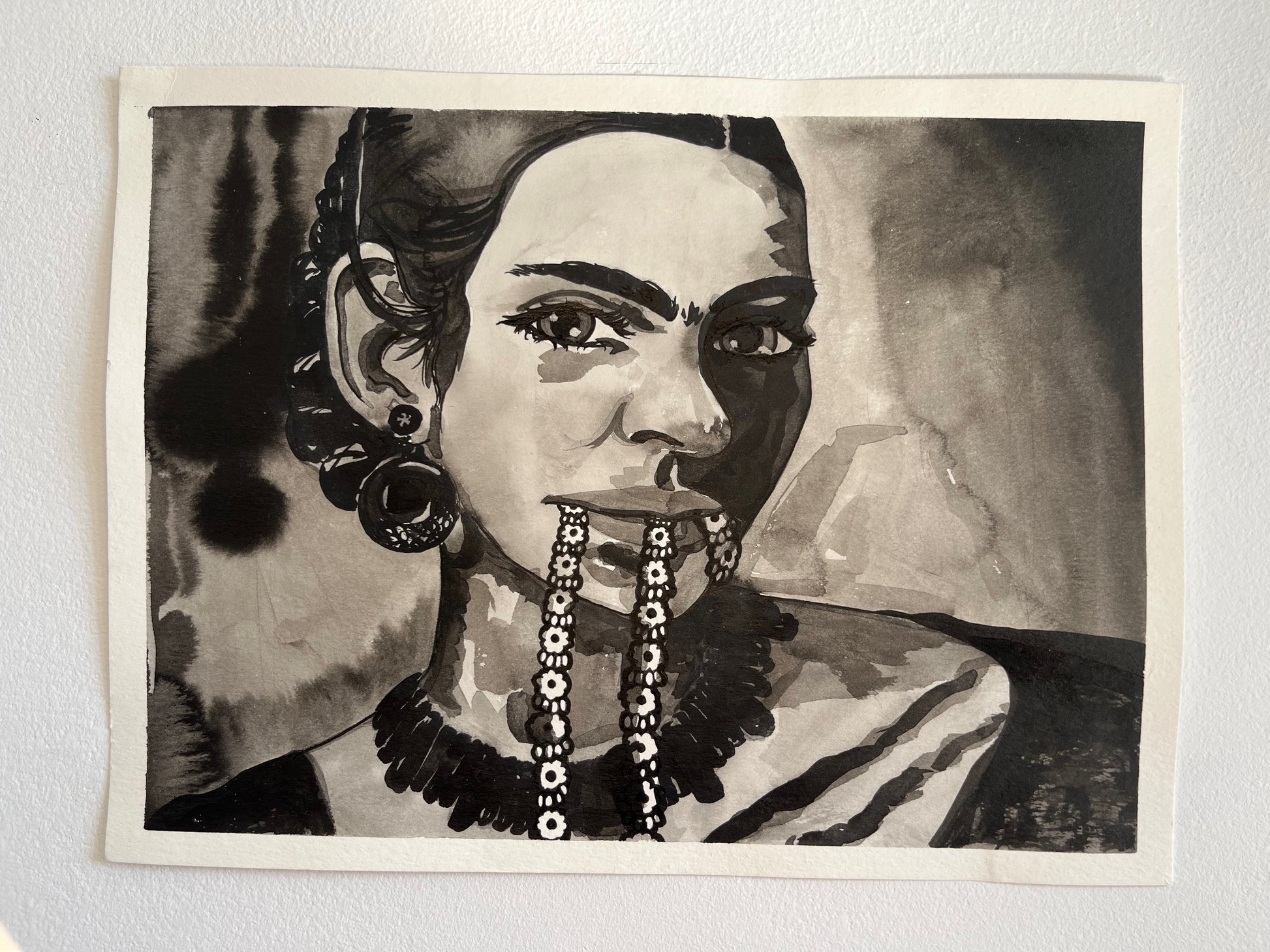 This original work is part ink painting, part ink sketch, and all parts Frida Kahlo. :) The inspiration to paint this came from a photograph taken of Kahlo by Lucienne Bloch in the 1930s. Like many an alt millennial girl, growing up I found Frida and her paintings super inspiring. Her role in the Mexican Communist Party and her mix of political concepts into her surreal and often spiritual paintings was an early example of how to do so. As an adult, she shows me it's possible to continue to create no matter the condition you're in; creating because you must, not necessarily to sell.